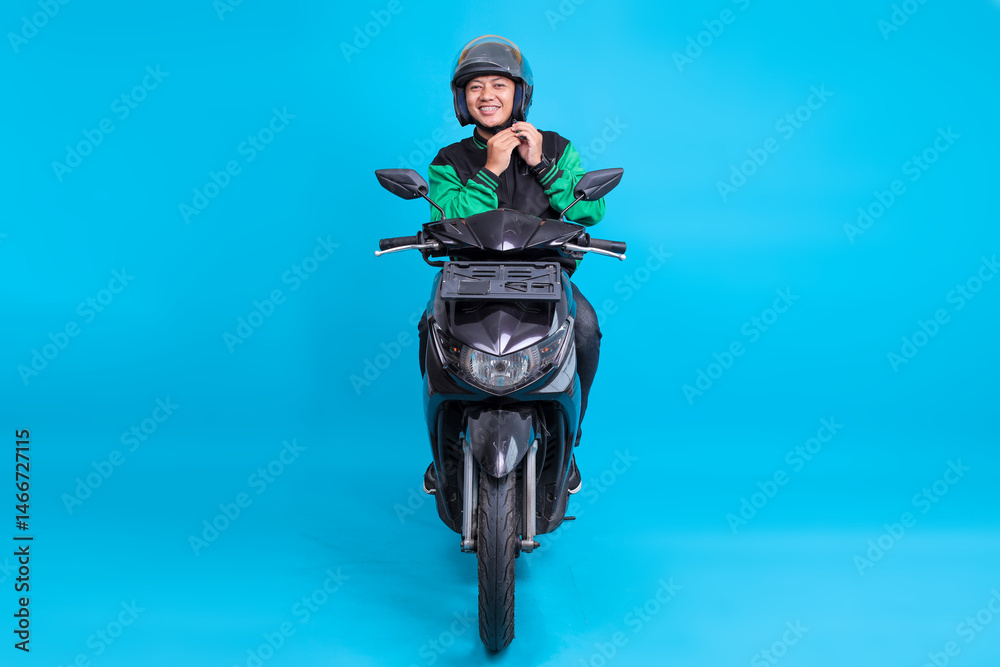 Full Length Portrait of Online Motorbike Driver Wearing a Helmet Before Picking Up Customers