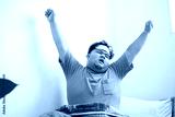 Asian Fat Man Wake Up in The Morning in Pajamas and Eye Mask