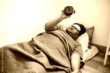Obese Man Lying in Bed Turning Off an Alarm Clock in The Morning