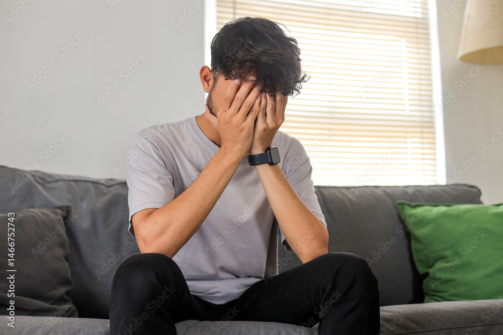 Sad Gloomy Man Covering His Face Feeling Sad And Sitting Alone At Home