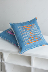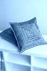 textile two blue pillows on a white background, the pillows are decorated with stitching and designer decors in the form of a labyrinth cut in the fabric through which visible multicolored lining