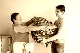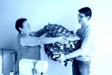 quilting and patchwork - smiling tailors stack at the hands of men finished product, made of pieces of colored patchwork fabrics near desktop with a sewing machine