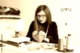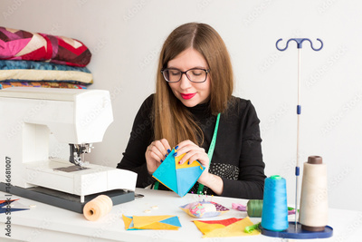 needlework and quilting of a young tailor - pretty woman tailor manually with needle stitching pieces of colorful fabrics at the workplace and thread, needles, a sewing machine and fabrics