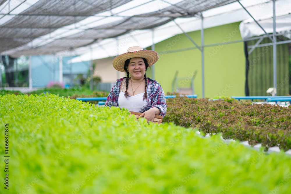 Farmer or gardener woman working lush green greenhouse garden carries wooden crate freshly harvested lettuce sustainable agriculture organic farm project growing fresh and care yield healthy produce.