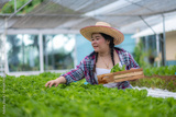 Farmer or gardener woman working lush green greenhouse garden carries wooden crate freshly harvested lettuce sustainable agriculture organic farm project growing fresh and care yield healthy produce.