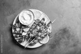 Mediterranean lunch with souvlaki skewers, tzatziki sauce and vegetables