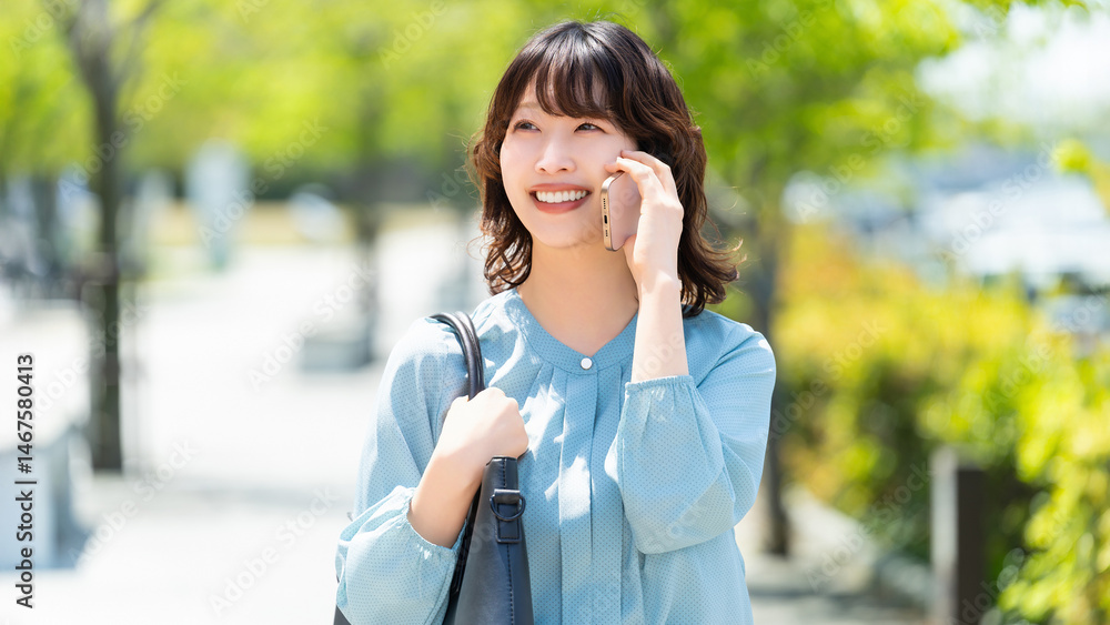 スマートフォンで話す笑顔の女性・ビジネスウーマン