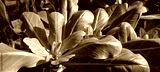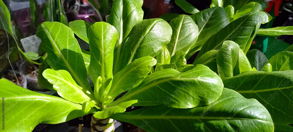 Close-up of a healthy green Brighamia plant, also known as Hawaiian palm, growing indoors. Bright natural light highlights its thick, glossy leaves.