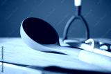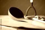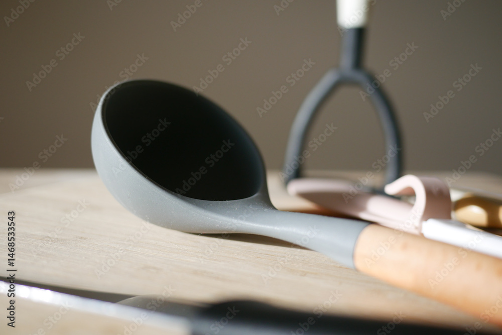 Kitchen utensils arranged on a wooden surface in soft lighting