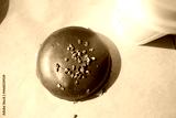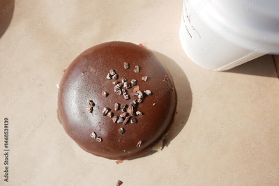 Chocolate dessert with sprinkles on brown paper in cafe setting