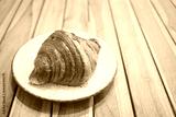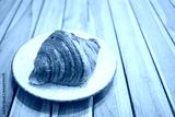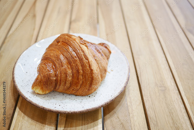 Warm and flaky croissant served on a white plate in a cozy cafe