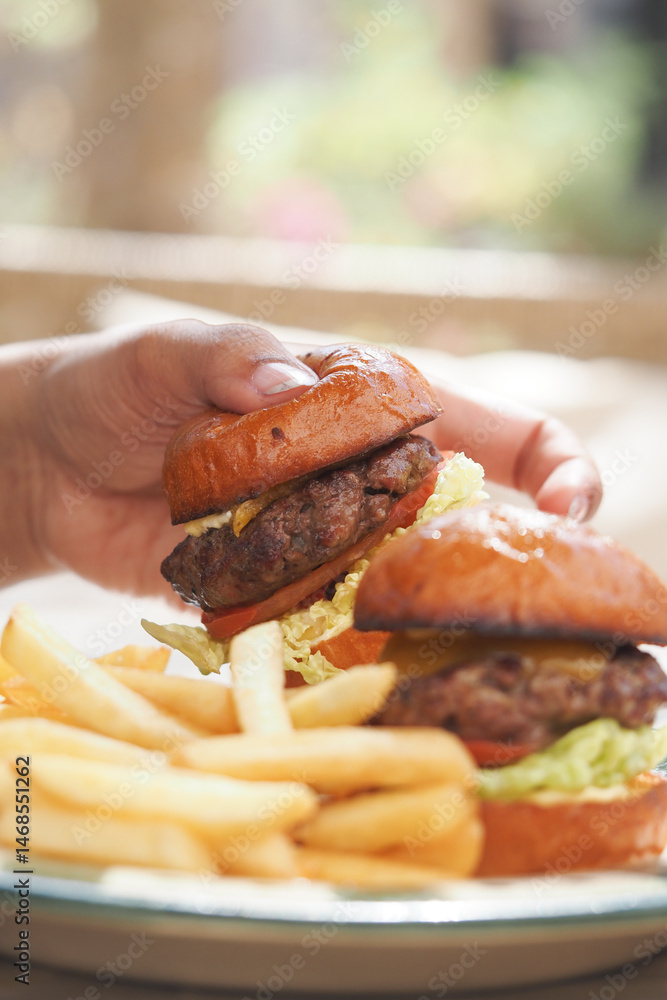Juicy burger stacked with toppings served with crispy fries