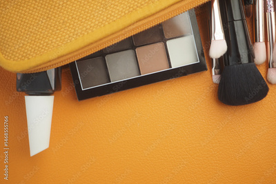 Makeup tools and palette organized in a stylish bag