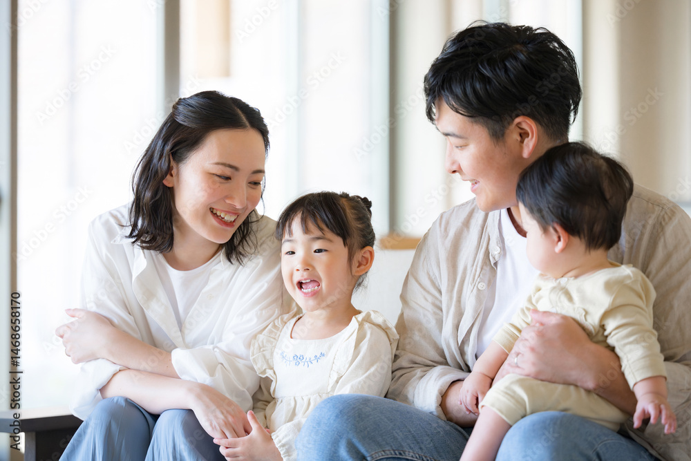 家の自宅のソファーでくつろぐ4人の幸せ日本人家族のみんなで笑顔の子育てイメージ クローズアップ