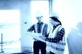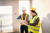 Architects and engineers collaborate at a desk, examining blueprints and documents, managing construction projects with expertise, strategy, technology, and teamwork.