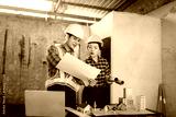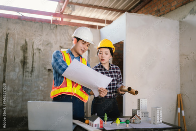 Engineers and contractors inspect construction plans indoors, using technology and equipment to ensure safety, structural integrity, planning, and confident teamwork.