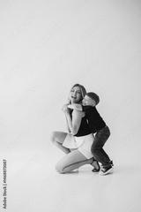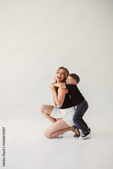 Mom and 4 year old son smiling and hugging on a white background. Warm relationship between mom and son. Concept of family relationships between mom and son.