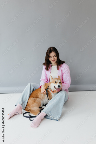 Cute brunette woman in white t-shirt and jeans hugging corgi puppy on white background. Love for animals, pets concept. cheerful woman holding welsh corgi dog.