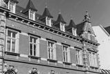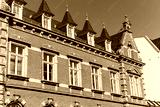 Ancient city buildings. Ancient brick church. Catholic cathedral made of stone.
