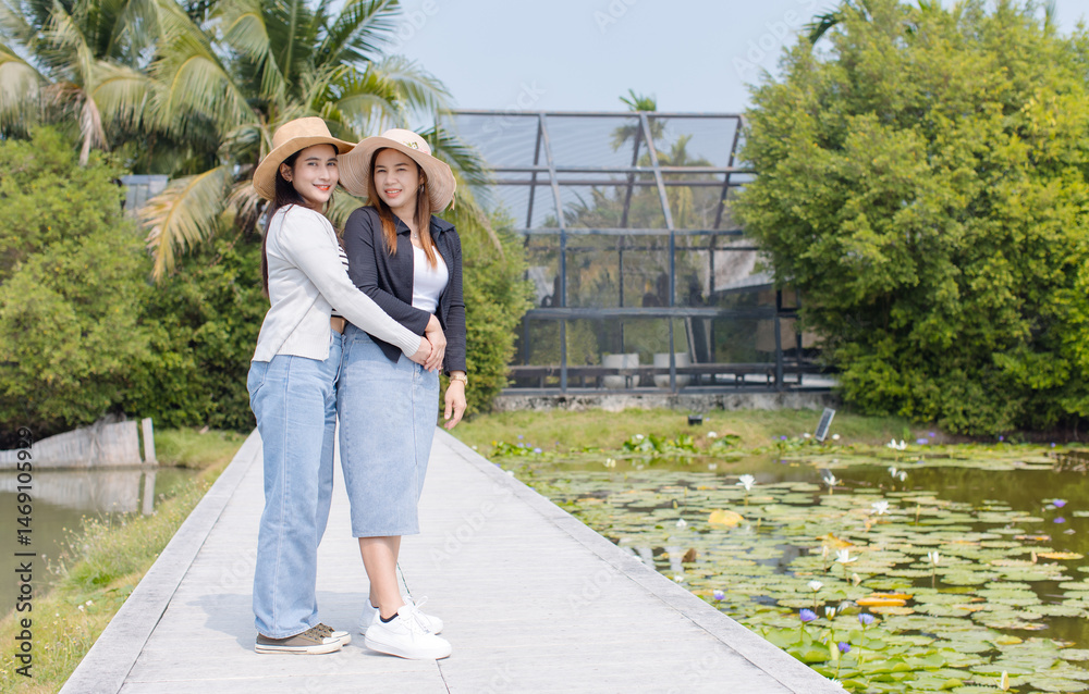 Two asian beautiful women holding hands walking happy smile enjoy nature near rice fields in greenery park peaceful daylight outside summer on sunny day, friendship vacation weekend lifestyle concept.