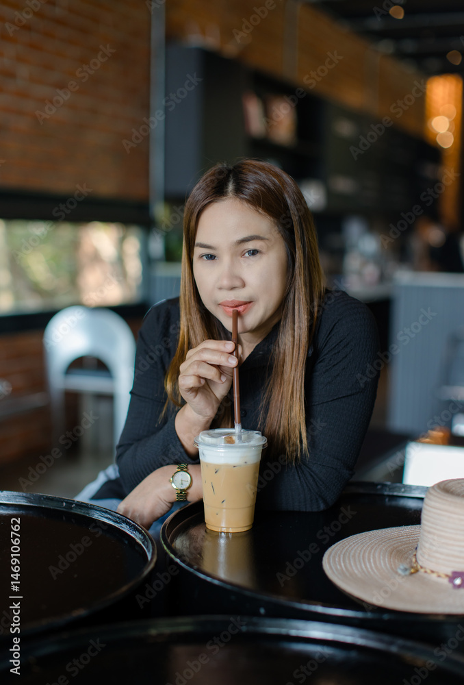 Asian young woman smiles happy relaxed in cozy cafe drinking iced late coffee cup wearing black cardigan and white top while her straw hat rests on table beside. Sunlight filters through large windows