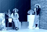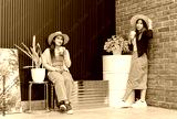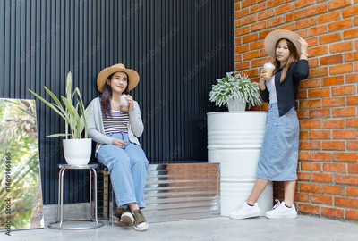 Two asian beautiful woman wearing straw hat happy smile enjoying nature while sitting and standing on black wall decorate daylight outside summer on sunny day friendship vacation weekend lifestyle.