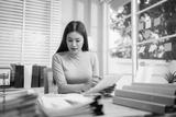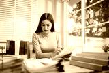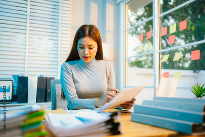 An Asian businesswoman working late into the night on her laptop illuminated by city lights conveys the determination of modern urban life and dedication to her career.