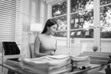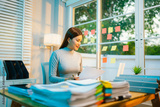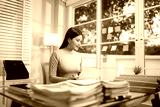 An Asian businesswoman working late into the night on her laptop illuminated by city lights conveys the determination of modern urban life and dedication to her career.