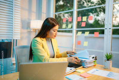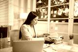 An Asian businesswoman working late into the night on her laptop illuminated by city lights conveys the determination of modern urban life and dedication to her career.