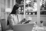 An Asian businesswoman working late into the night on her laptop illuminated by city lights conveys the determination of modern urban life and dedication to her career.