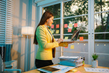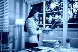 Dedicated businesswoman working late at night in a dimly lit office, focused on her laptop amidst looming deadlines and digital connections — a portrait of modern professionalism and perseverance.