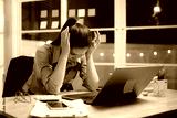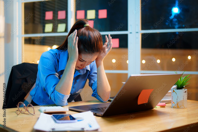 Exhausted businesswoman works late into the night, overwhelmed by stress, deadlines, and endless paperwork in a dim office setting