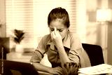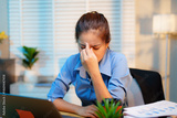 Exhausted businesswoman works late into the night, overwhelmed by stress, deadlines, and endless paperwork in a dim office setting