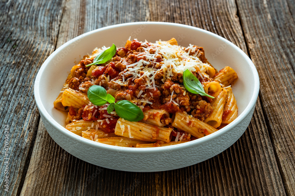 Rigatoni con ragù alla bolognese - noodles with bolognese sauce and grated parmesan cheese served in bowl on wooden table