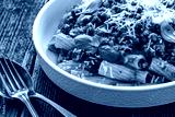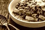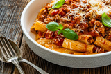 Rigatoni con ragù alla bolognese - noodles with bolognese sauce and grated parmesan cheese served in bowl on wooden table