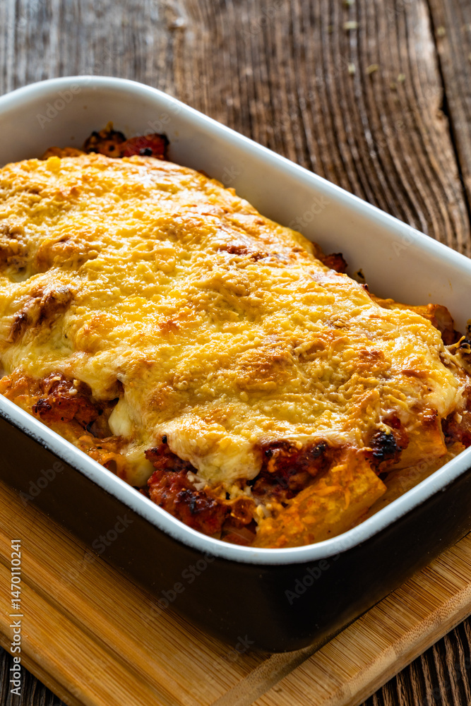 Rigatoni con ragù alla bolognese casserole - roasted noodles with bolognese sauce and mozzarella cheese on wooden table