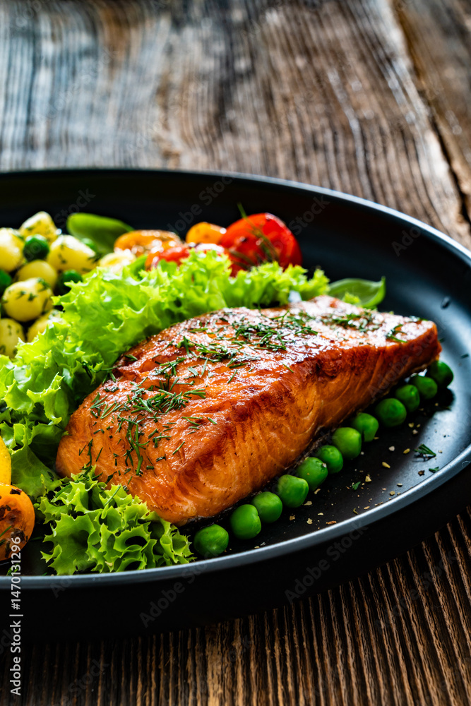Seared salmon steak with gnocchi, green peas and tomatoes on wooden table