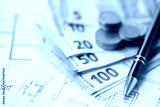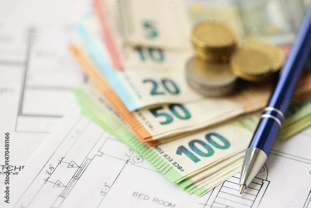 European union Euro money bills and coins with construction project blueprints on table