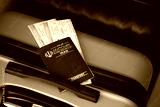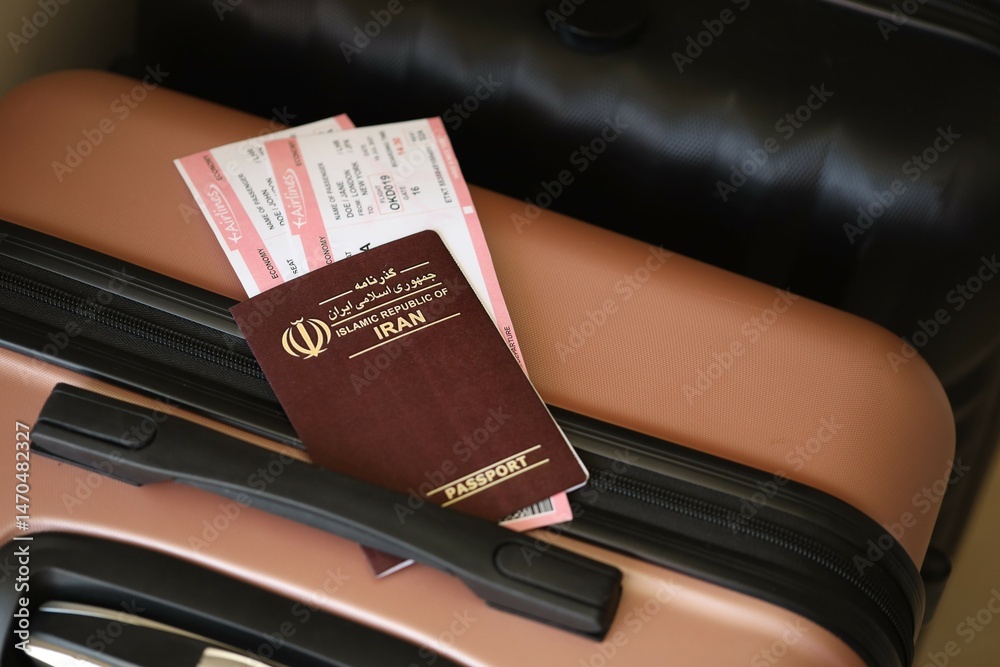 Islamic Republic of Iran passport with tickets lies on touristic suitcase close up in airport hall