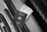 Germany passport with tickets lies on touristic suitcase close up in airport waiting hall