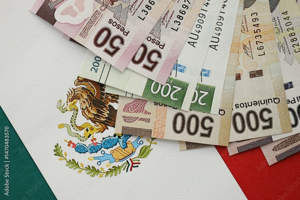 Mexican pesos money bills in big amount lies on Mexico flag close up