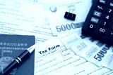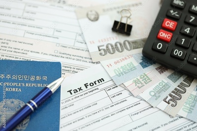 North Korean won money bills lies on table with pen, calculator, passport and tax forms