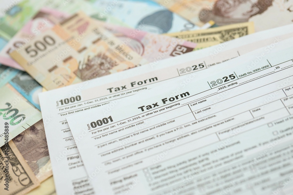 Big amount of money bills of different currencies and countries and tax report blank form ready to fill. Assortment background of international cash in big pile close up