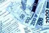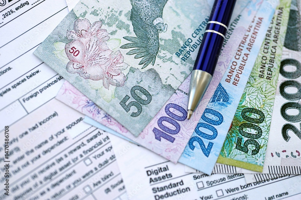 Argentine pesos money bills in big amount lies on table with pen and tax forms close up