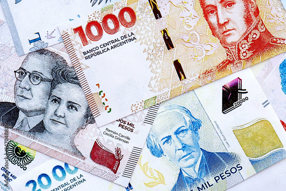 Argentine pesos money bills in big amount lies on white table close up. Finance and banking concept