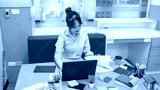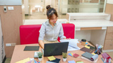 Young Asian Interior Designer Working on Laptop with Blueprints and Color Swatches in Modern Office Space | Design Concepts, Planning, and Creative Workspace