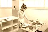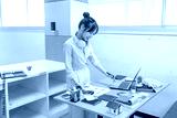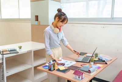 Asian Young Interior Designer Woman Working on Laptop with Material Samples House Models and Design Sketches Creative Workspace For Interior Design and Decoration