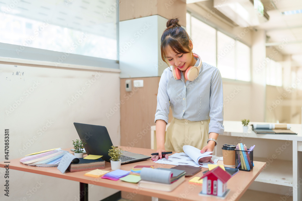 Asian Young Interior Designer Woman Reviewing Designs with Laptop, Color Swatches, and Miniature House Model on Desk for Home Renovation Project