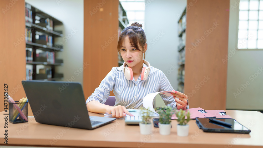 Asian Young Woman Studying with Laptop Calculator and Book in Library - Academic Research and Educational Success Preparation