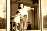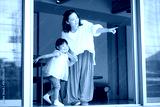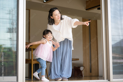 庭先や軒先がある部屋でくつろぐ手を繋ぐ母親と娘(子供)子育ての幸せのイメージ 見上げる指を差す